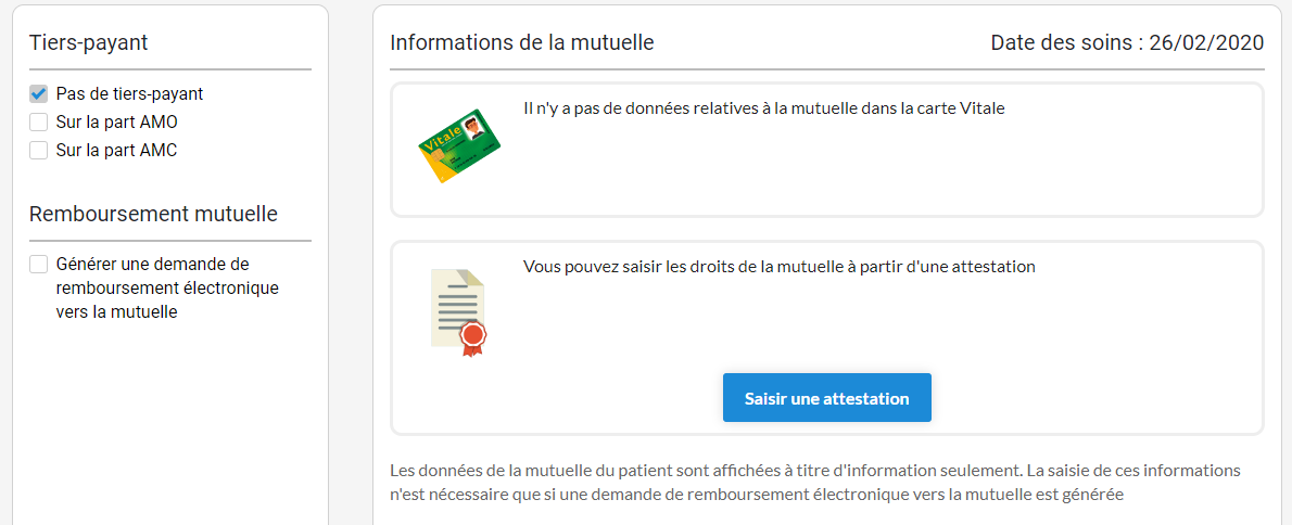 Si le professionnel de santé préfère ne pas utiliser le tiers payant, il peut sélectionner l'option Pas de tiers-payant.