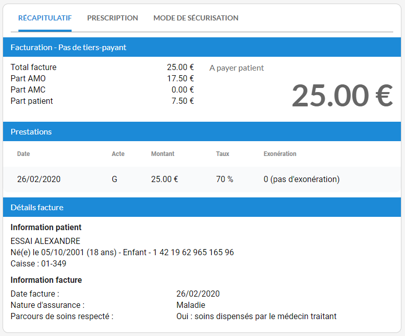 Dans ce cas, le motif Pas d'exonération est automatiquement choisi, entraînant un remboursement des soins partiel par l'Assurance Maladie Obligatoire. Cela donne la liberté au professionnel de santé de décider s'il souhaite appliquer le tiers-payant ou non.