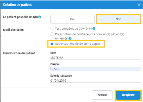 Assurez-vous de sélectionner Non pour indiquer que le patient n'a pas de NIR et n'oubliez pas de choisir le motif  Autre cas : feuille de soins papier avant de procéder à l'enregistrement.