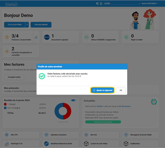 À la fin de la création d'une nouvelle facture pour le même patient, Stellair vous offre la possibilité d'inclure le montant de la dette dans le règlement du jour :