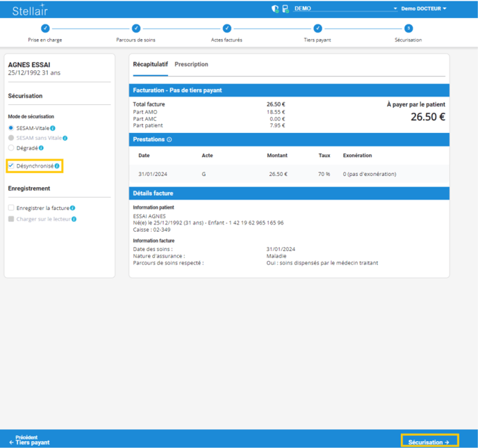 Suivez chaque étapes de création de la facture et à l'étape Récapitulatif, sélectionner le mode de sécurisation Désynchronisé. et cliquez sur Sécurisation.