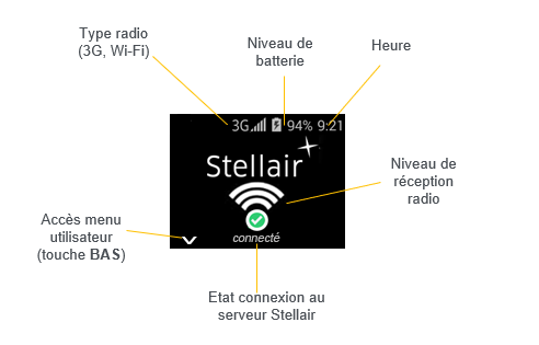 Assurez-vous que la réception radio est correcte, et que le lecteur est bien connecté au serveur Stellair. (votre lecteur est prêt lorsqu'il affiche "connecté" avec un symbole vert)