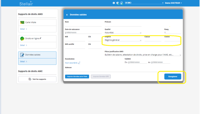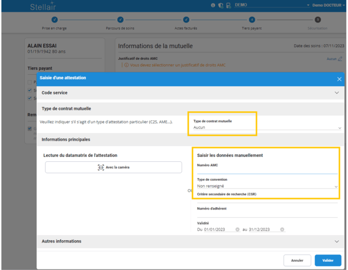 Saisissez manuellement les informations contenues sur l'attestation présentée par votre patient, puis cliquez sur Valider