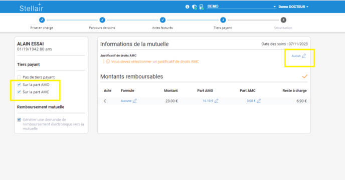 A l'étape 4 Tiers-payant, cochez sur la part AMO et sur la part AMC