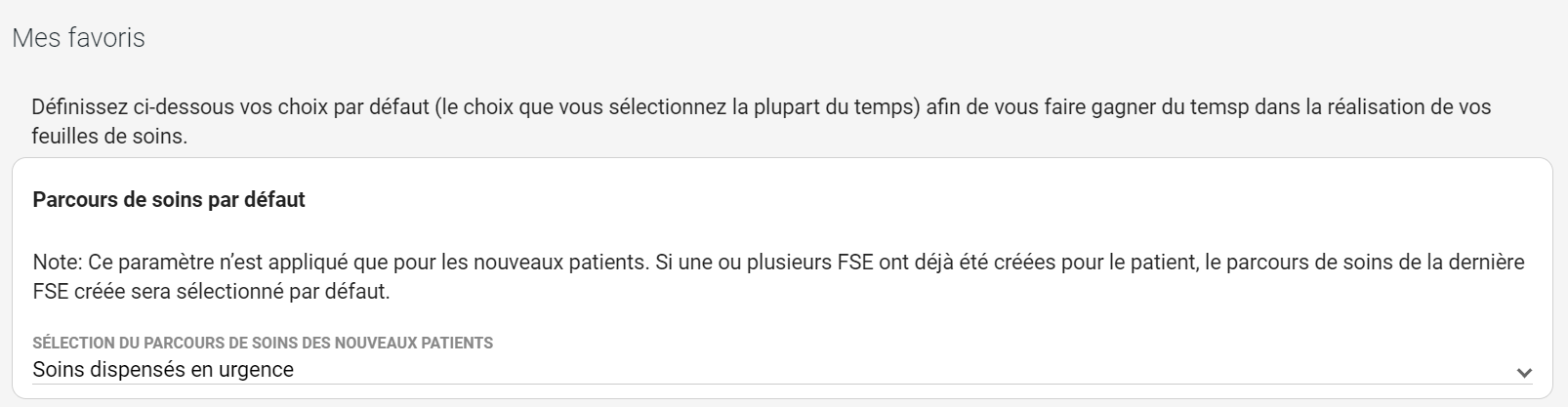 Le parcours de soins choisi par défaut dans le cas d’un nouveau patient peut être sélectionné dans les paramètres favoris.
