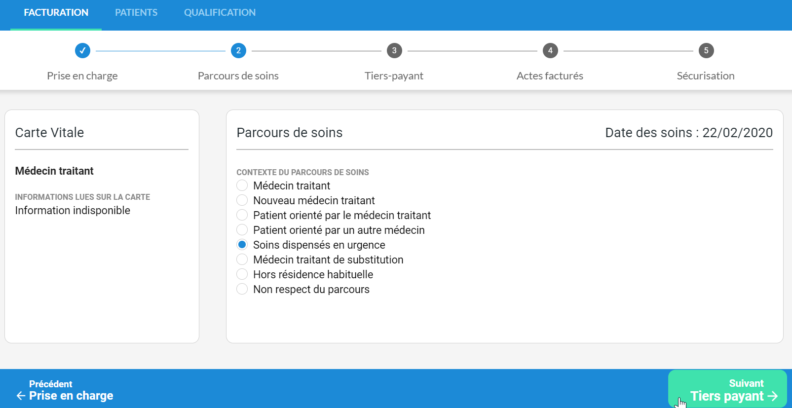 Par exemple, dans ce cas le médecin sélectionne le parcours de soins par défaut « Soins dispensés en urgence ».