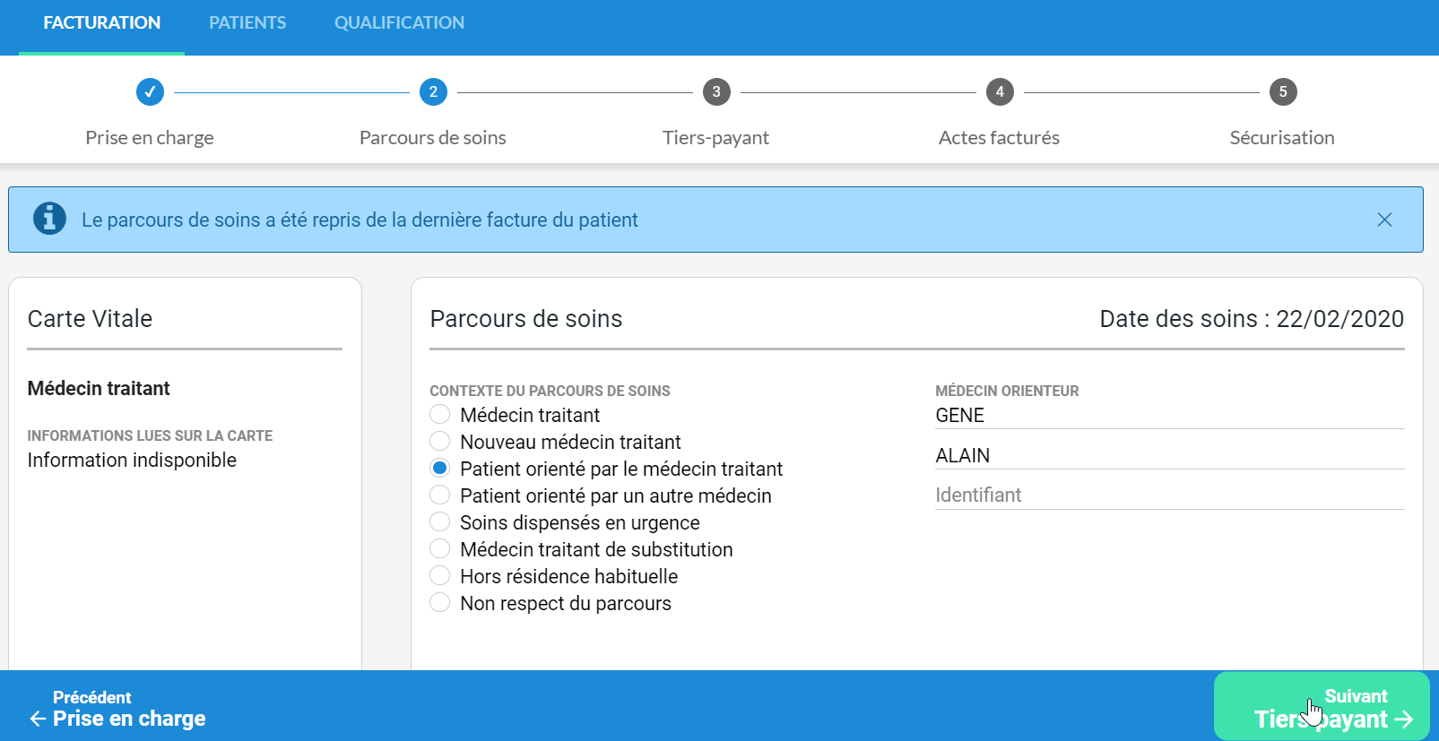 Lorsque le médecin verra à nouveau son patient, le parcours de soins qui sera sélectionné par défaut sera celui saisi lors de la dernière feuille de soins réalisée avec ce même patient. Si un médecin orienteur avait été saisi, celui-ci sera inscrit par défaut.