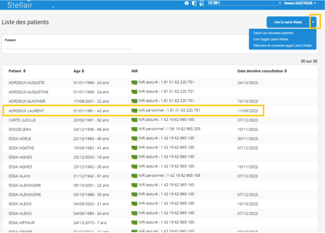 Pour cela, cliquez sur la petite flèche à droite de l’option Lire carte Vitale, puis sélectionnez Saisir un nouveau patient
